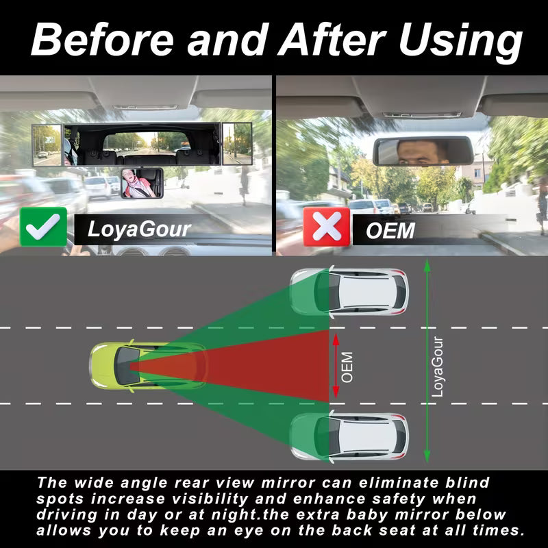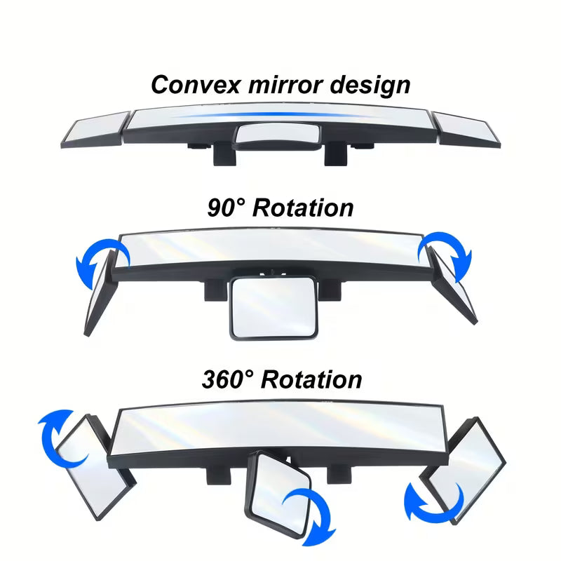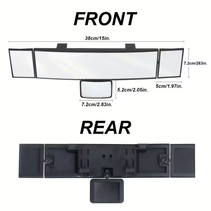 Uno specchio pieghevole per auto dotato di una struttura multifunzione. Presenta un design composto da più sezioni regolabili che permettono una visione più ampia dell’area circostante. Le parti sono orientabili grazie a un sistema girevole e possono essere adattate tramite una regolazione quadrupla. Il corpo dello specchio è richiudibile, così da occupare poco spazio quando non viene utilizzato. L’aspetto complessivo è compatto, con superfici riflettenti disposte in modo da offrire un campo visivo esteso.