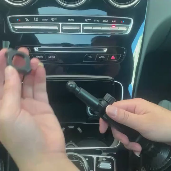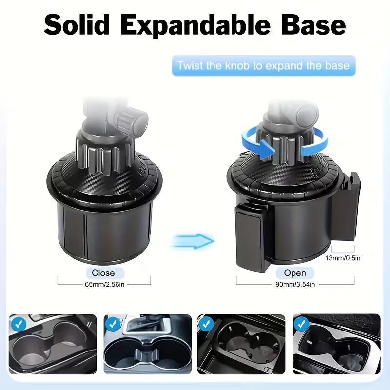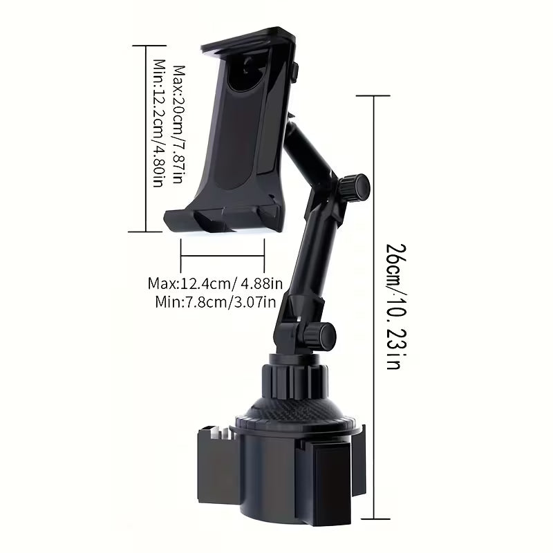 Un supporto per dispositivi mobili progettato per essere inserito nel portabicchiere dell’auto. È dotato di una base regolabile che permette di adattarsi a diversi vani portabicchiere dei veicoli. La parte superiore include un braccio estensibile e un sistema di fissaggio compatibile con smartphone e tablet con dimensioni comprese tra 10,16 e 33,02 cm. La struttura è realizzata in materiale ABS e presenta una testa girevole che permette di orientare il dispositivo in varie direzioni. L’intero supporto può ospitare dispositivi come iPad Mini, Air, Pro, iPhone e altri modelli di telefoni e tablet.