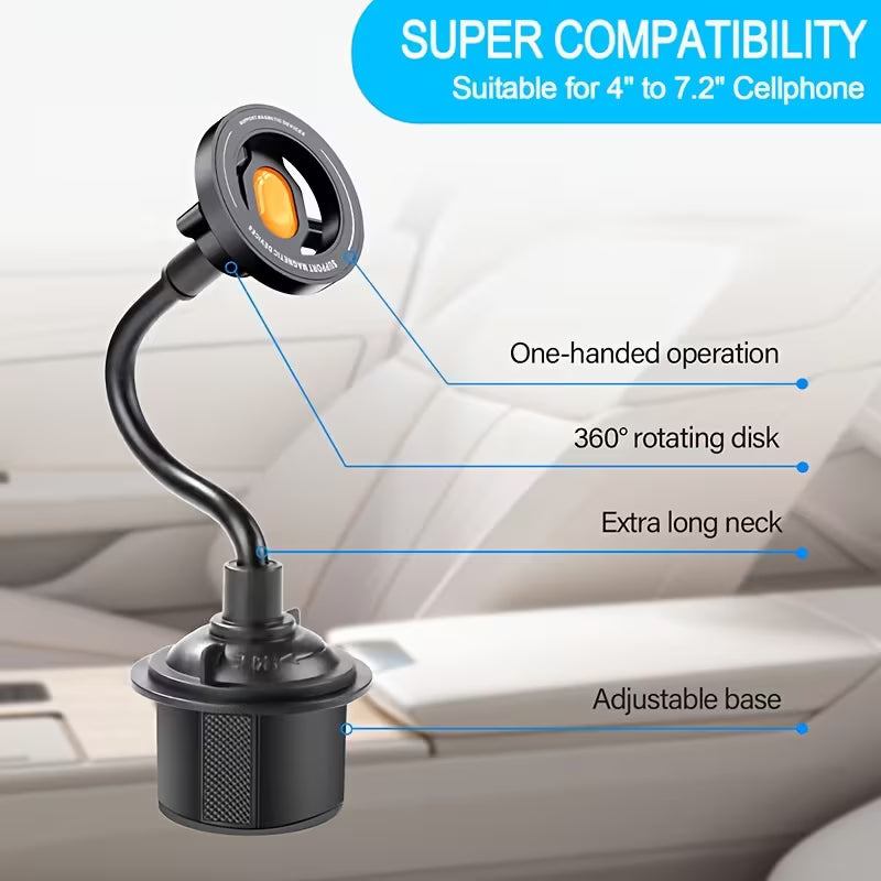 Supporto magnetico per cellulare da auto progettato per l’inserimento nel portabicchieri del veicolo. La base è dotata di un sistema di larghezza regolabile, che consente l’adattamento alla maggior parte dei portabicchieri standard presenti nelle auto. Il fissaggio avviene tramite un meccanismo a espansione, pensato per mantenere il supporto in posizione durante l’utilizzo.