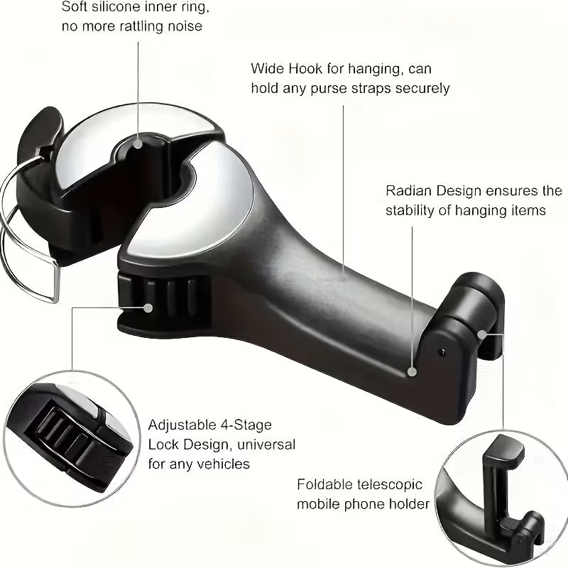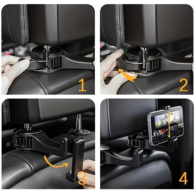 Supporto per telefono con montaggio sul poggiatesta, realizzato in ABS resistente.